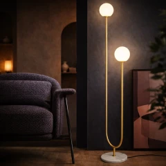 AURDEN to lampa podłogowa LED zaprojektowana z myślą o najbardziej wymagających użytkownikach. Połączenie szklanych kulistych kloszy, złotego wykończenia oraz solidnej marmurowej podstawy tworzy wyjątkowy produkt, który doskonale odnajdzie się zarówno w nowoczesnych, jak i klasycznych wnętrzach.