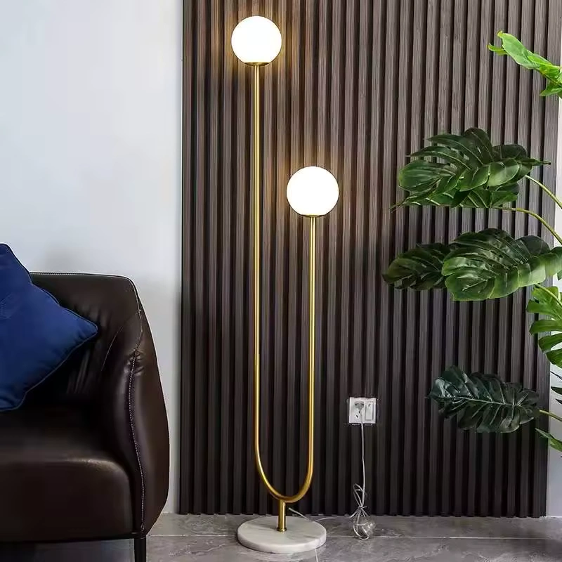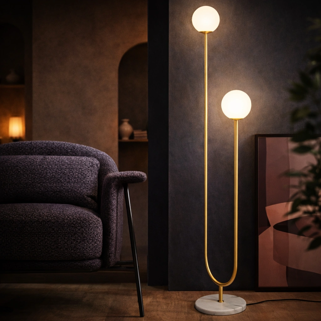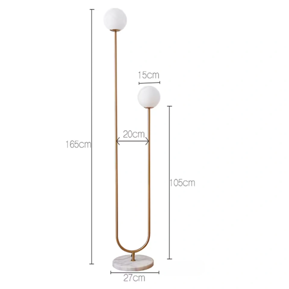 Stylowa lampa stojąca z dwoma kulistymi kloszami, idealna do sypialni, salonu lub gabinetu. Połączenie szkła, metalu i naturalnego marmuru tworzy elegancki akcent w każdym wnętrzu. Gotowa do użycia – zawiera żarówki LED.