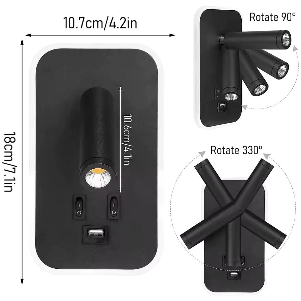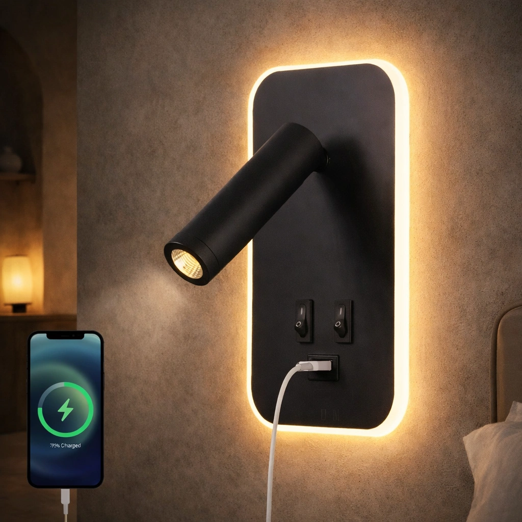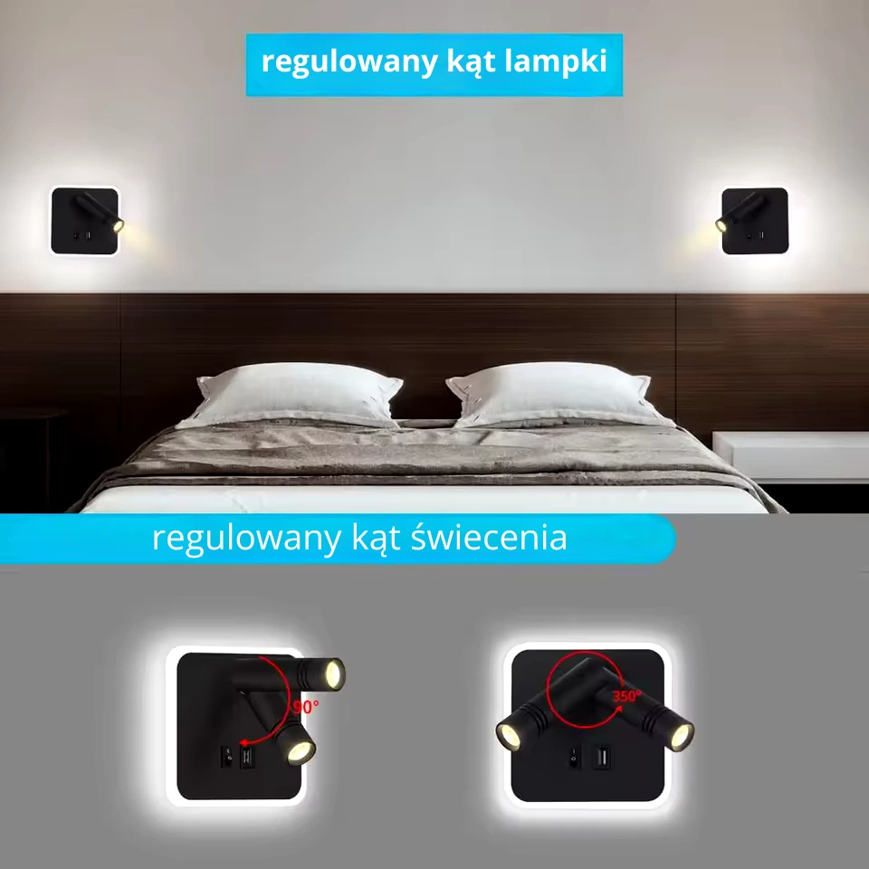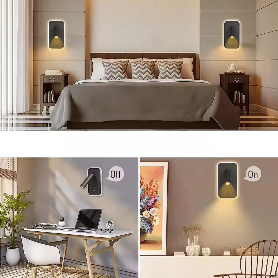 Minimalistyczny kinkiet ścienny z niezależnie sterowaną lampką nocną, reflektorem do czytania i wbudowanym portem USB do ładowania. Idealny do sypialni, gabinetu i pokoi hotelowych. Regulowany kąt świecenia, nowoczesny design i wygoda użytkowania w jednym kompaktowym rozwiązaniu.