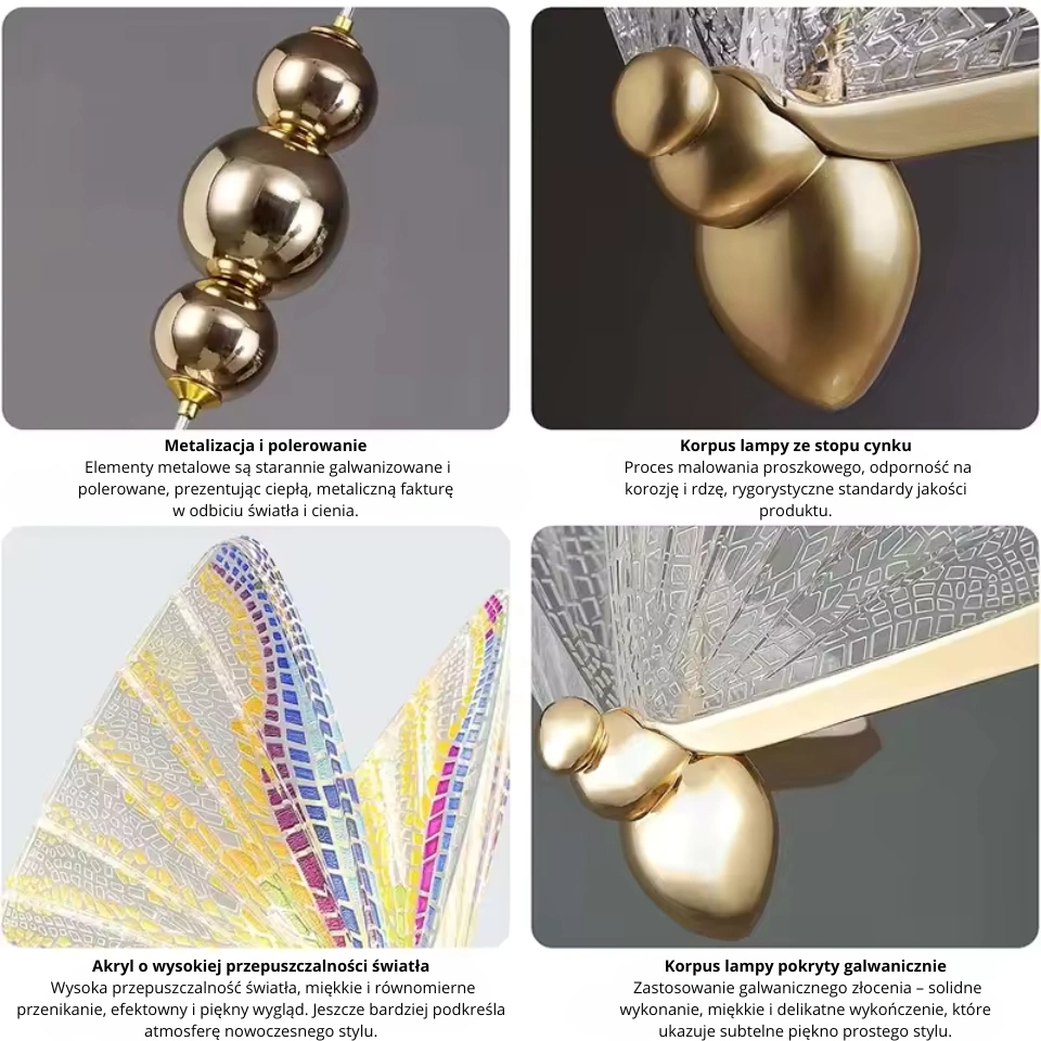 Delikatna forma lampy, przypominająca unoszącego się motyla, wprowadza bajkowy klimat i unikalny charakter do każdego wnętrza. Idealnie wpasuje się w nowoczesne, romantyczne lub eklektyczne aranżacje.