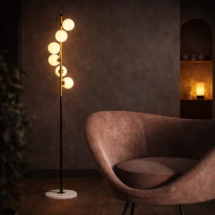 Każdy element tej lampy – od marmurowej podstawy, przez pionową oś wykonaną z żelaza, aż po szklane kule przypominające rozświetlone planety – został zaprojektowany z myślą o nadaniu wnętrzu głębi, światła i nieco kosmicznej poezji.