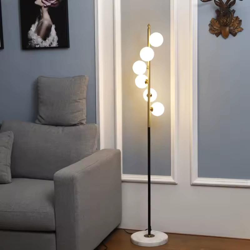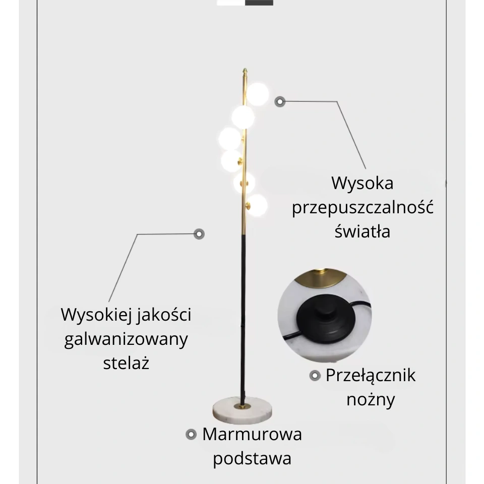 Elegancka lampa stojąca z kulami ze szklanego kamienia na żelaznym korpusie, inspirowana układem gwiazd Drogi Mlecznej. Idealna do salonu, sypialni lub foyer. Nowoczesny styl, certyfikowane komponenty, wysoka jakość wykonania.