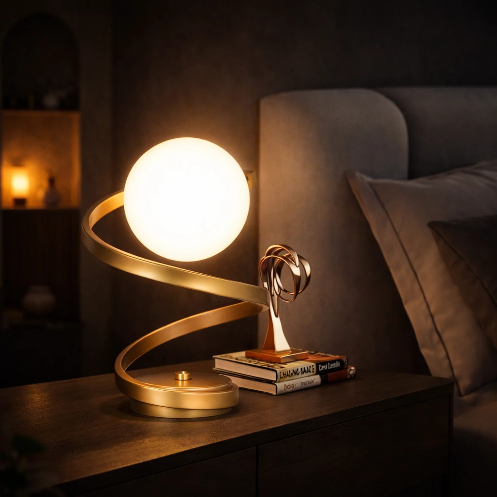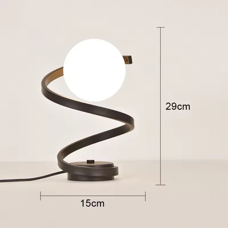 Lampa stołowa SYVRA to przykład współczesnej elegancji. Jej spiralna konstrukcja tworzy optyczną iluzję ruchu, a kulisty klosz LED delikatnie osadzony na szczycie sprawia wrażenie unoszącego się światła. To doskonały akcent do sypialni, salonu, domowego biura czy strefy relaksu.