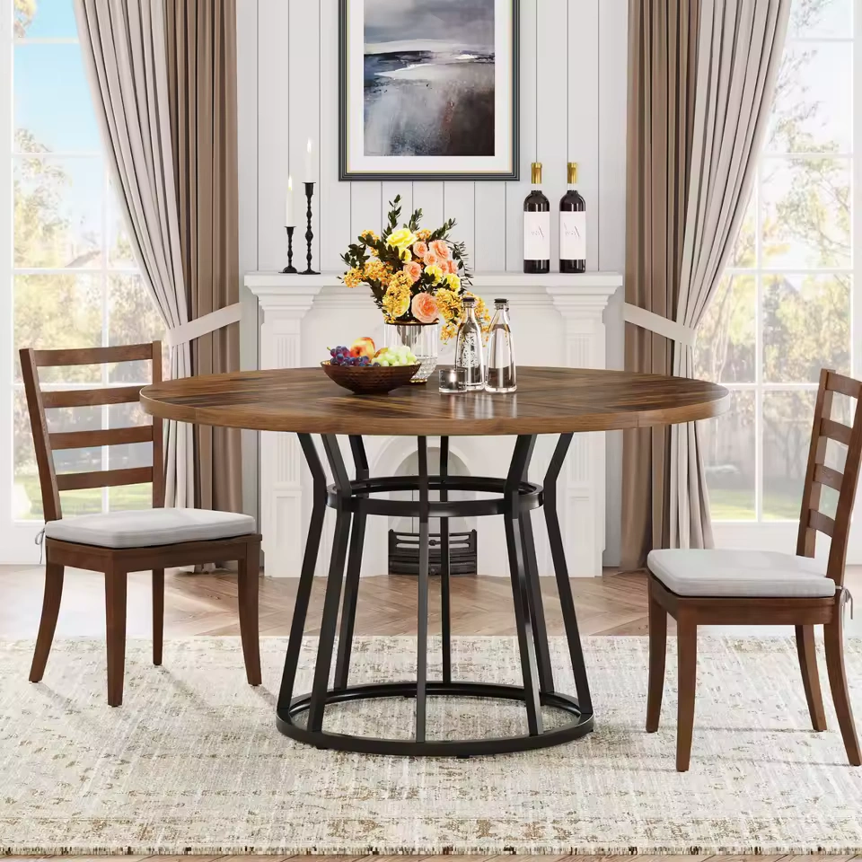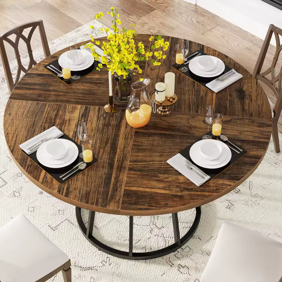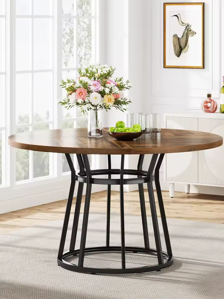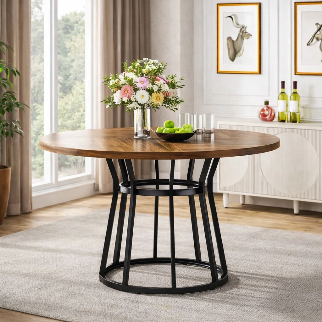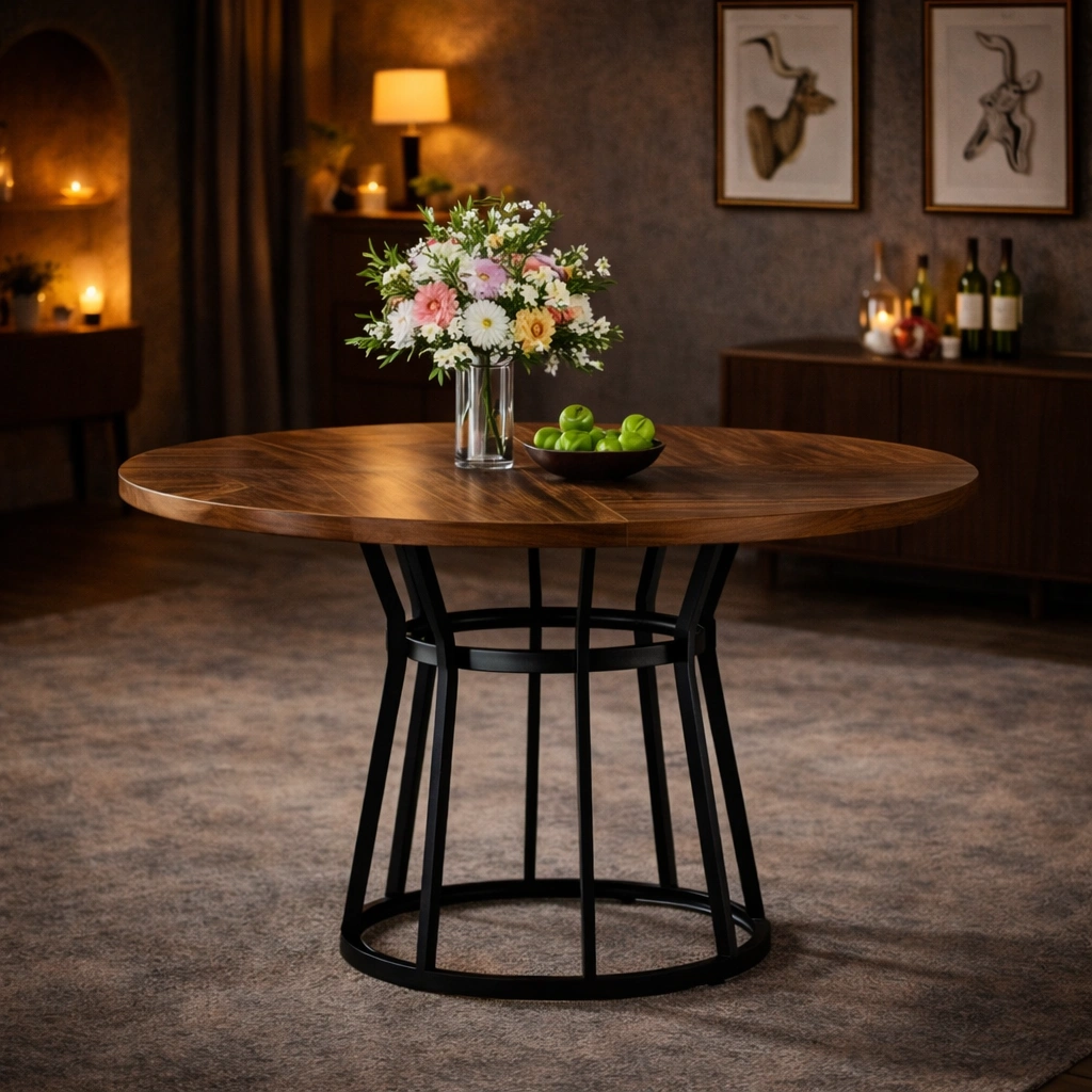 Elegancki stół o średnicy 120 cm z wytrzymałym blatem i metalową podstawą. Stylowy wygląd w odcieniach brązu i czerni doskonale pasuje do jadalni i kuchni. Stabilna konstrukcja, łatwy montaż i komfortowe miejsce dla 4 osób – idealny na codzienne posiłki i spotkania z bliskimi.