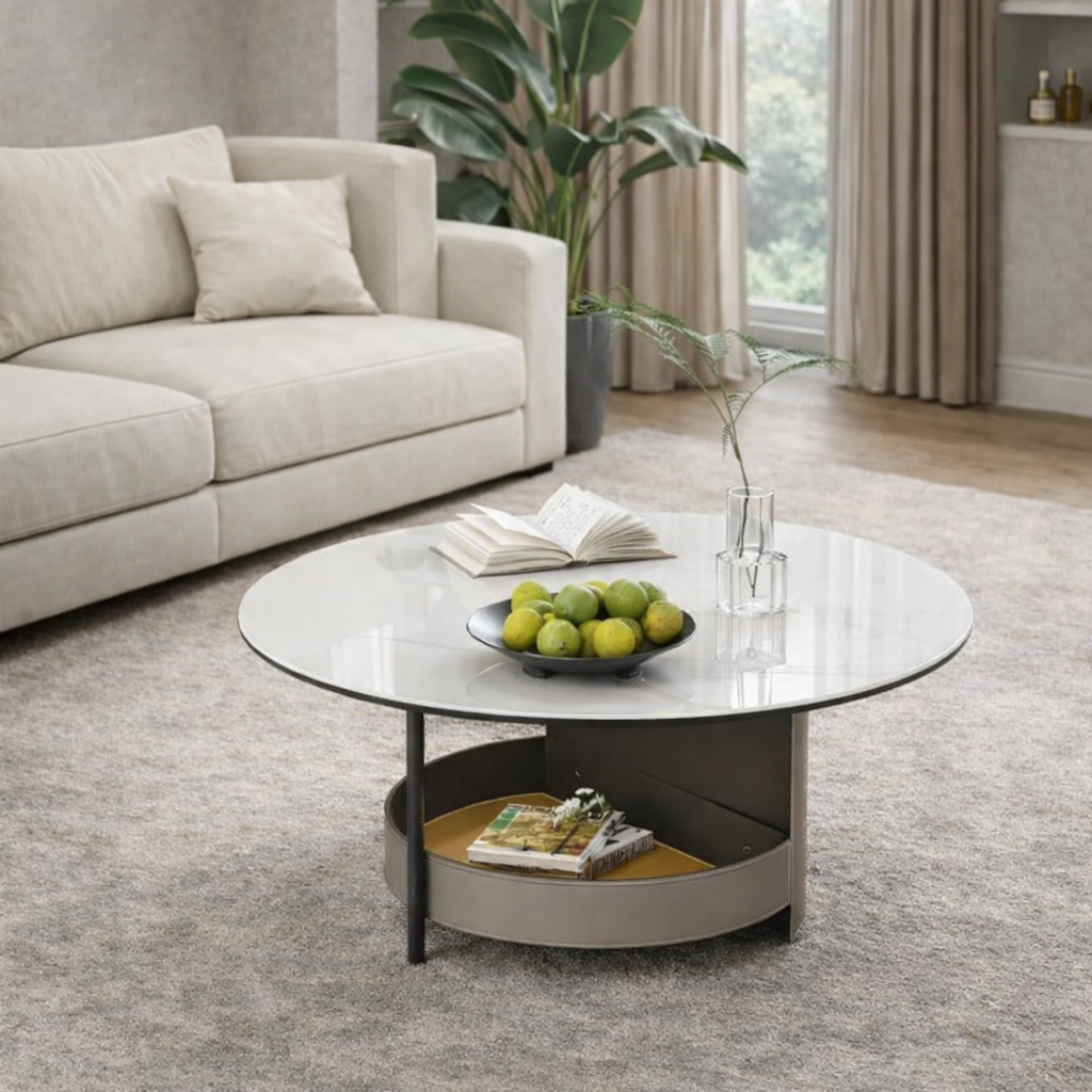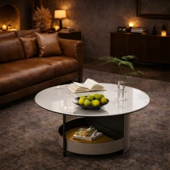Elegancki, okrągły stolik łączący wytrzymały blat ze spieku kamiennego Bentley z funkcjonalną, półokrągłą półką ze skóry siodłowej z mikrofibry. Zachwyca wyrafinowaną formą, trwałością i nowoczesnym designem, stanowiąc stylowy punkt centralny każdego salonu.