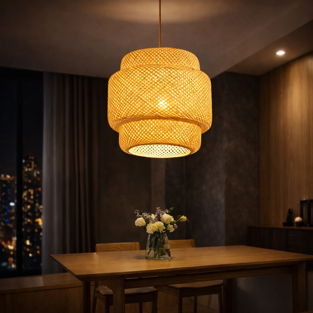 Naturalna, ręcznie pleciona lampa wisząca Silarin zachwyca minimalistycznym designem i ciepłym światłem. Wykonana z bambusa i drewna, idealnie sprawdzi się w salonie, sypialni, jadalni czy hotelowym lobby, wprowadzając atmosferę spokoju i harmonii.
