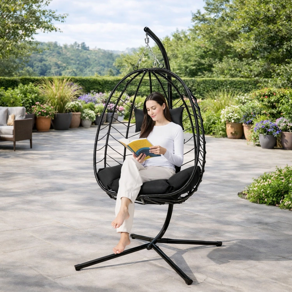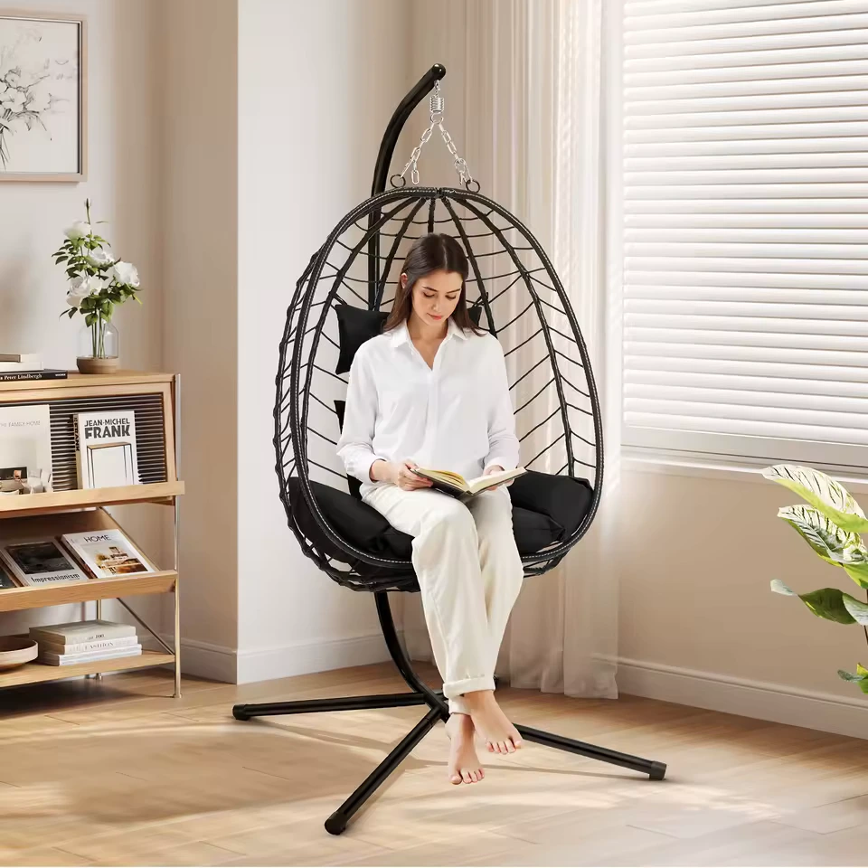 Wiszący fotel ratanowy typu jajko z poduchami i stelażem Eira