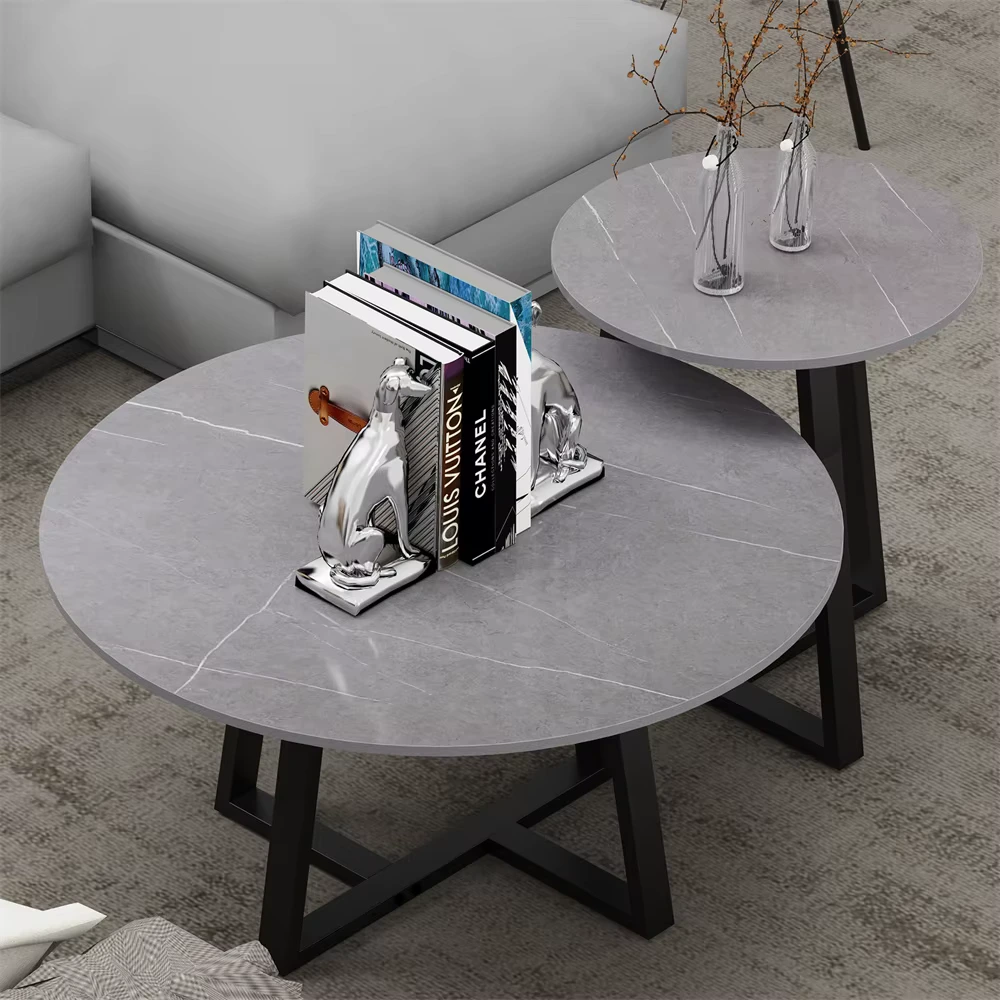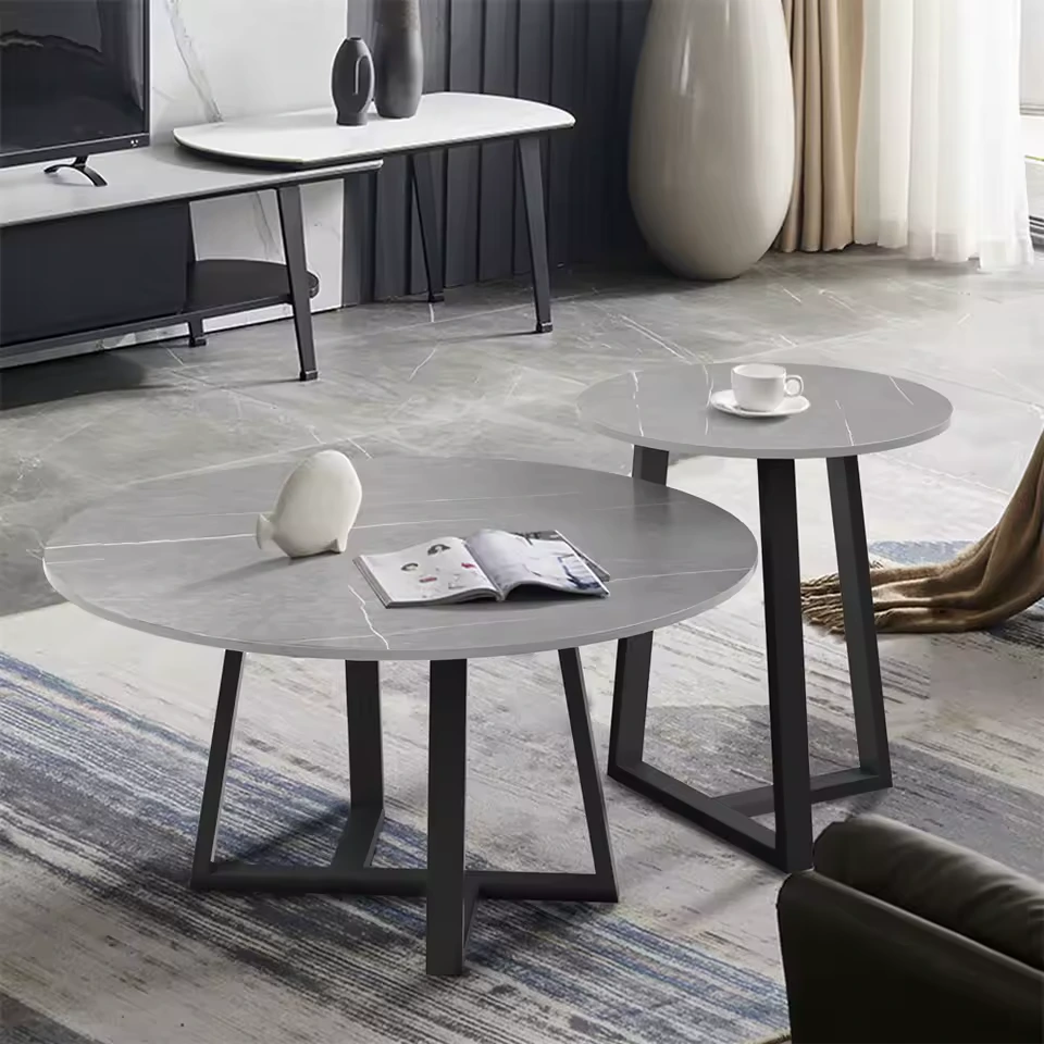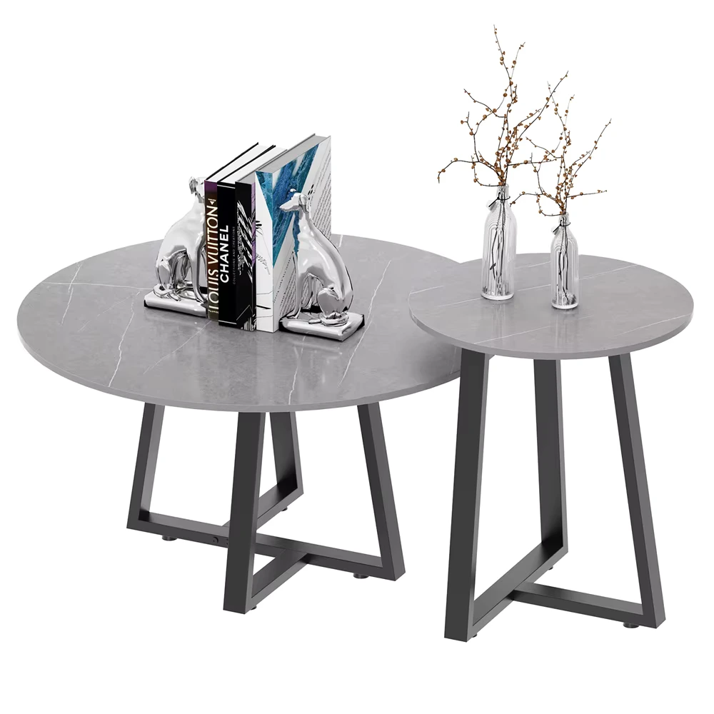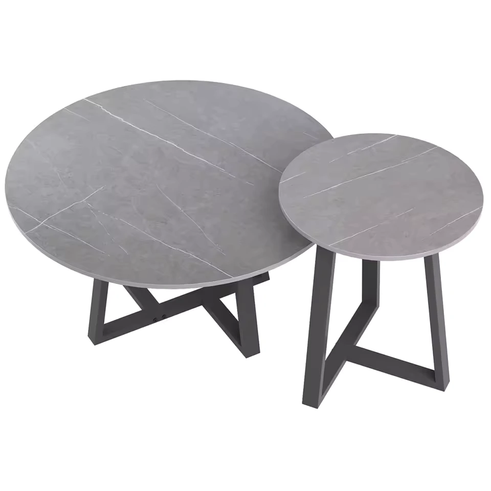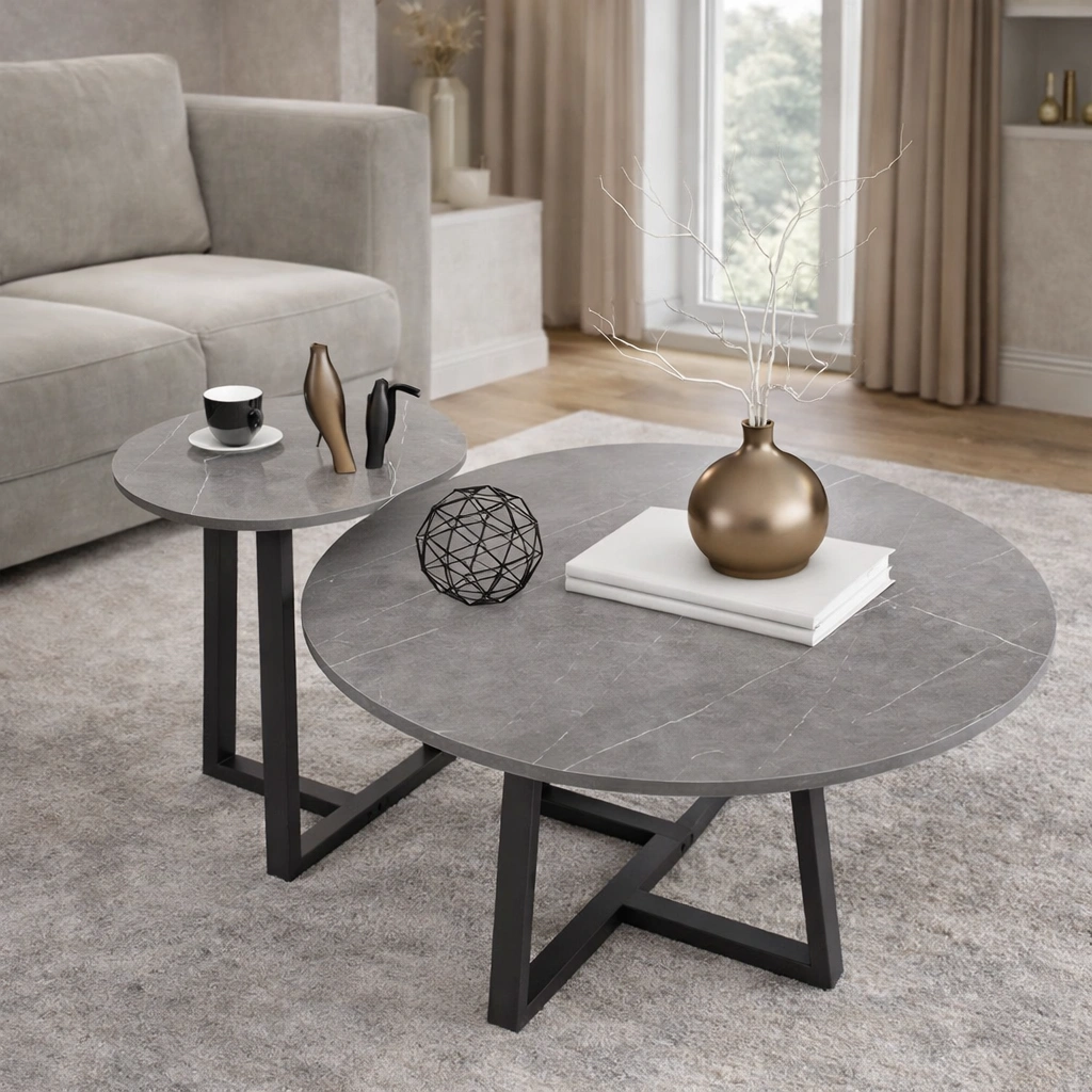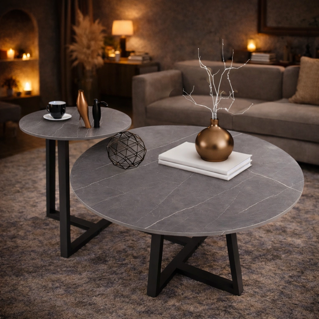 Elegancki duet stolików w stylu minimalistycznym. Okrągłe blaty z trwałego spieku kamiennego są odporne na zarysowania, wysoką temperaturę i wilgoć. Stabilna metalowa konstrukcja malowana proszkowo gwarantuje wytrzymałość i nowoczesny wygląd. Idealne do salonu, sypialni lub domowego biura. Możliwość użycia razem lub osobno.